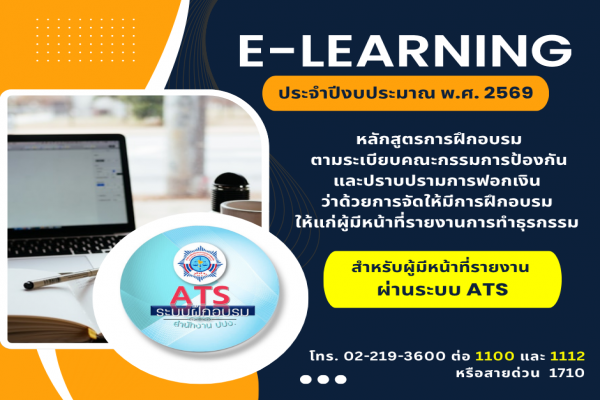 กำหนดการอบรมรูปแบบ e-learning ผ่านระบบบริหารจัดการฝึกอบรมและประเมินความรู้ในเรื่องกฎหมายว่าด้วยการป้องกันและปราบปรามการฟอกเงิน (AMLO Training System : ระบบ ATS) สำหรับผู้มีหน้าที่รายงานการทำธุรกรรม (ได้รับใบประกาศนียบัตร)